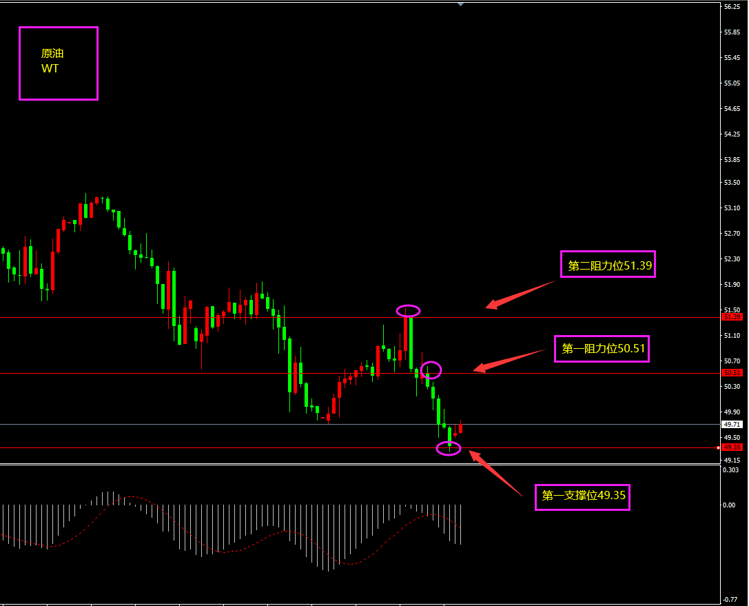 技术点评:天图原油从65跌至50,因近期全球股市暴跌,市场需求下降,但最艰难的时刻已经度过,随着市场的刺激,需求量将会上升,油价会慢慢上涨,但天图需要等待底部企稳,底部阳线出则多头起。小时图原油昨日冲高之后再次大幅回落,但下方支撑已经越来越明显,且下方投机者刺激买盘较多,原油50以下更多以看涨为主?