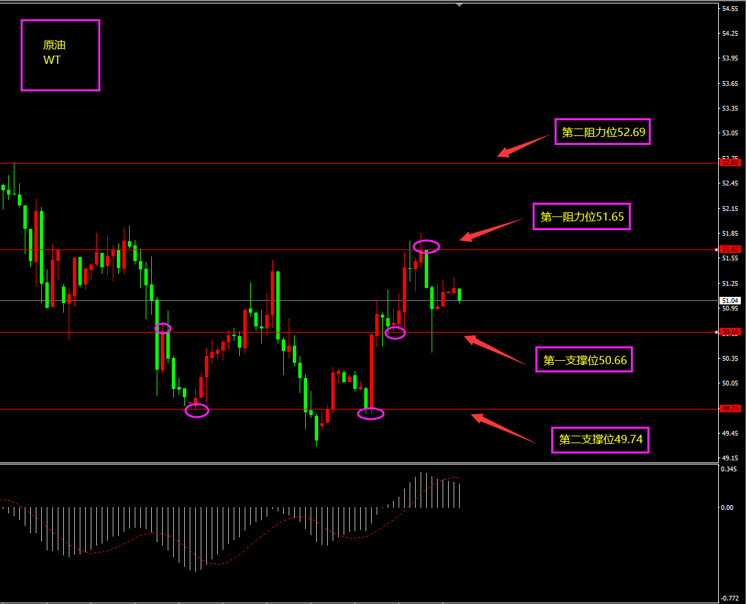 技术点评:天图原油从65跌至50,因近期全球股市暴跌,市场需求下降,但最艰难的时刻已经度过,随着市场的刺激,需求量将会上升,油价会慢慢上涨,未来看向55?小时图原油期间有连续阳线拉升,底部MACD转移至0轴之上,多头占据主导,原油日内更多以逢低看多?