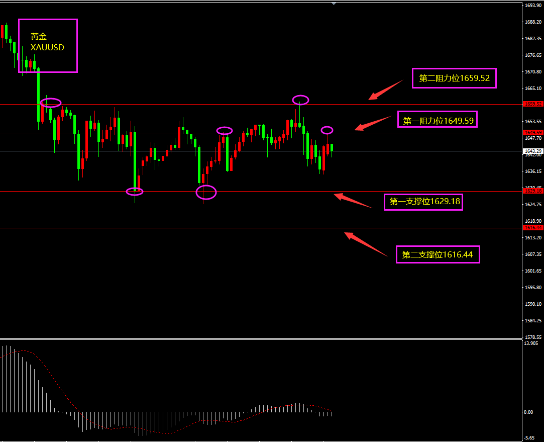 技术点评:天图黄金昨日收十字星,价格一度冲高之后回落,形成长上影线,实体部分未形成有效打破,上方空头阻力仍在,黄金日内保持以震荡以及震荡下行为主?小时图黄金期间出现连续回落,但目前仍处在底部震荡(1629-1659),MACD位于0轴附近,走势修复中,等待行情爆发,日内保持以逢高看空为主?