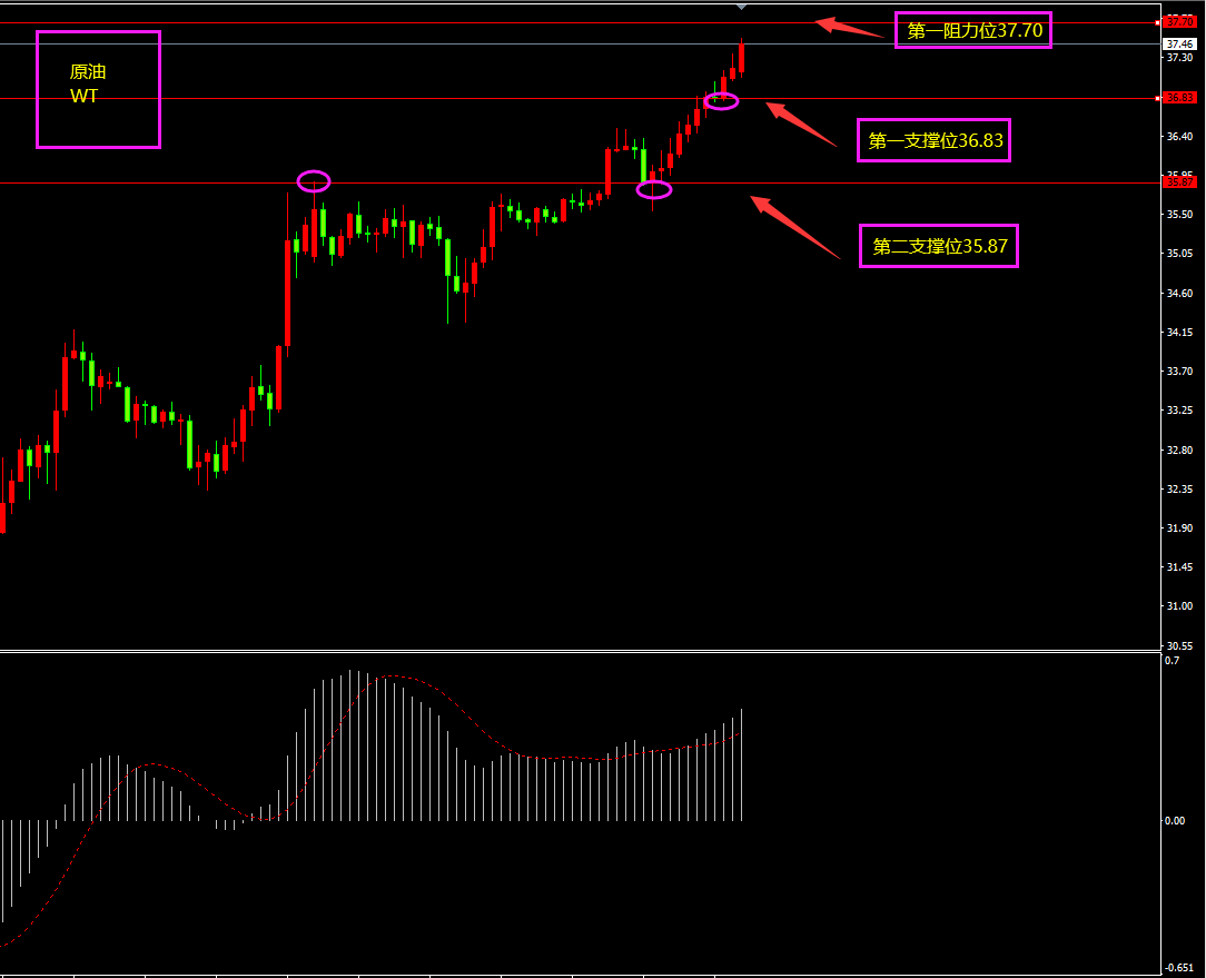 策略分析:第一、二支撑位附近轻仓看多,如有大阴线跌破第二支撑则转为观望。
