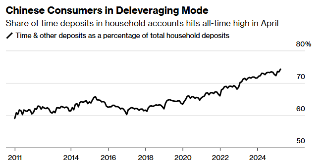 在长达数年的房地产市场低迷以及贸易战可能导致中国庞大制造业和出口行业裁员的担忧下,消费者信心依然脆弱。花旗经济学家表示,4月份定期存款占所有家庭账户的比例达到了历史最高水平,这表明人们可能“仍处于去杠杆模式”。