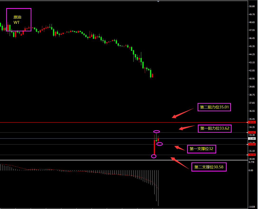 技术点评:天图原油“吞没形态”失效,短期基本面非常不利,OPEC谈崩,俄罗斯未按预期减产,沙特4月增产,促使原油供过于求引发市场抛售,短期底部阳线不出,多单不入。小时图原油跳空低开,因消息面所致,短期底部有大阳线产生,下行空间小幅受到支撑,日内保持以震荡为主。